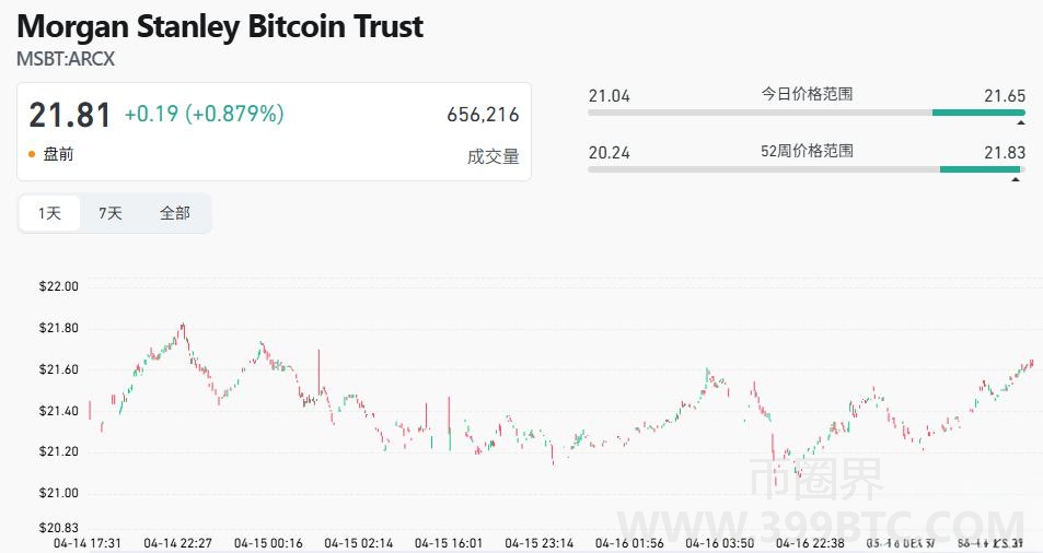在2026年4月市场普遍回调、多数ETF资金净流出的背景下,摩根士丹利比特币现货ETF(MSBT)却逆势而上,上市仅6个交易日就实现累计净流入突破1.03亿美元。这一表现不仅超越了WisdomTree Bitcoin Fund(WBTC)自2024年1月上市以来累计的8,600万美元净流入,更释放出机构投资者在价格低点进行系统性布局的明确信号。MSBT的亮眼表现:数据背后的市场逻辑