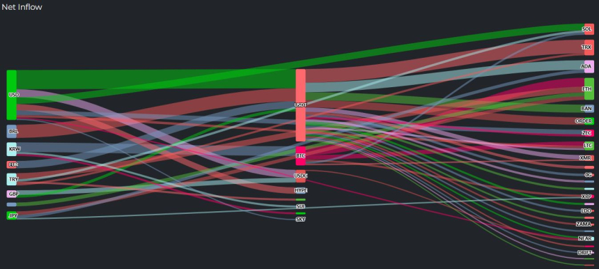 在近期市场波动背景下,比特币于过去五小时内出现明显资金净流出,与此同时,美元、韩元、巴西雷亚尔等法定货币以及各类稳定币成为资本主要流入方向。