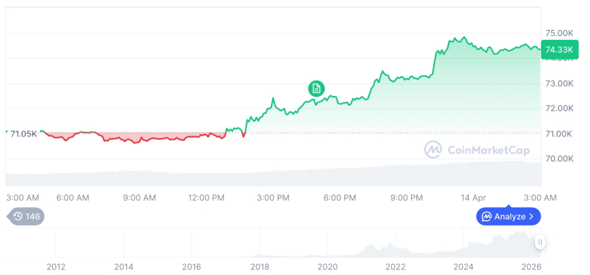 截至4月14日下午12时4分59秒(韩国标准时间),比特币价格攀升至74,365.78美元(约合1.108亿韩元),较前一日上涨4.65%。以太坊同步走高,报价达2,368.43美元(约合352万韩元),涨幅为7.95%。