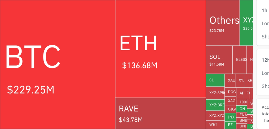 在最近一个24小时周期内,加密货币市场的清算活动主要集中于比特币(2.2925亿美元)和以太坊(1.3668亿美元)。根据清算热力图数据,RAVE遭遇约4378万美元的强制平仓,XYZ达2050万美元,而Solana(SOL)则为1158万美元。尽管头部资产仍占据清算量主导地位,但市场波动已明显向部分中小市值代币扩散。