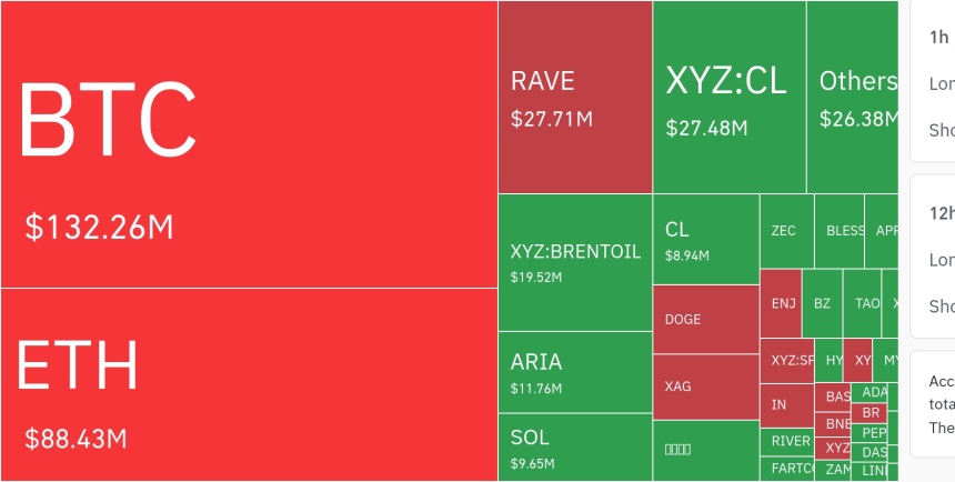 Tether黄金(稳定币挂钩资产)在24小时内清算额达506万美元,1小时尺度下空头清算343万美元,4小时尺度更达524万美元,均显著高于多头部分,说明即使具备避险属性的代币也未能幸免于波动。清算热力图显示,比特币(1.3226亿美元)与以太坊(8843万美元)居首,其次为Solana(965万美元)。此外,RAVE、XYZ:CL、XYZ:BRENTOIL等非传统加密符号亦出现高额清算,被市场解读为衍生品市场整体正在压缩杠杆敞口。