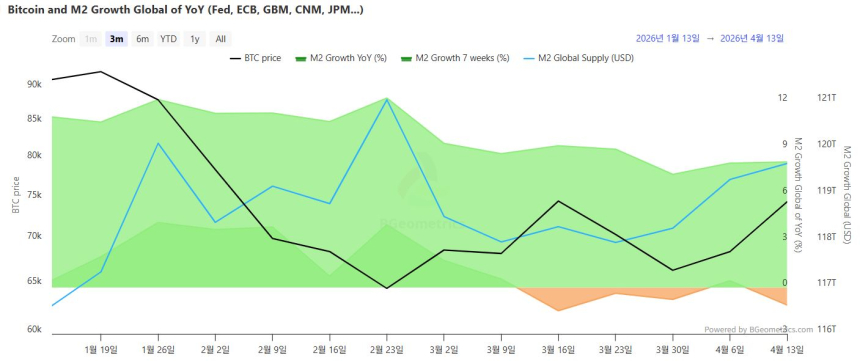 截至4月13日,全球M2总量达119.6761万亿美元,较前一周上升0.29%。然而,最近七周增长率转为负值,录得-1.13%,相比前一周的0.44%明显下滑,显示短期流动性再度收缩。尽管同比增幅回升至8.13%,高于此前的8.05%,但整体扩张节奏仍显乏力,表明当前处于低速增长通道。