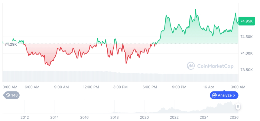 据最新数据,截至4月16日,比特币价格报74,900.64美元,较前一日上涨0.75%;以太坊则录得2,358.29美元,涨幅达1.43%,双核心资产协同拉升市场氛围。