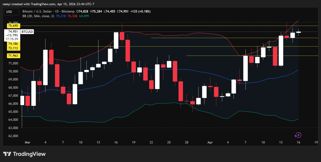 若价格在74,157美元至75,700美元区间反复拉锯,则可能延续横盘整理状态,该区间已多次触发技术反应。