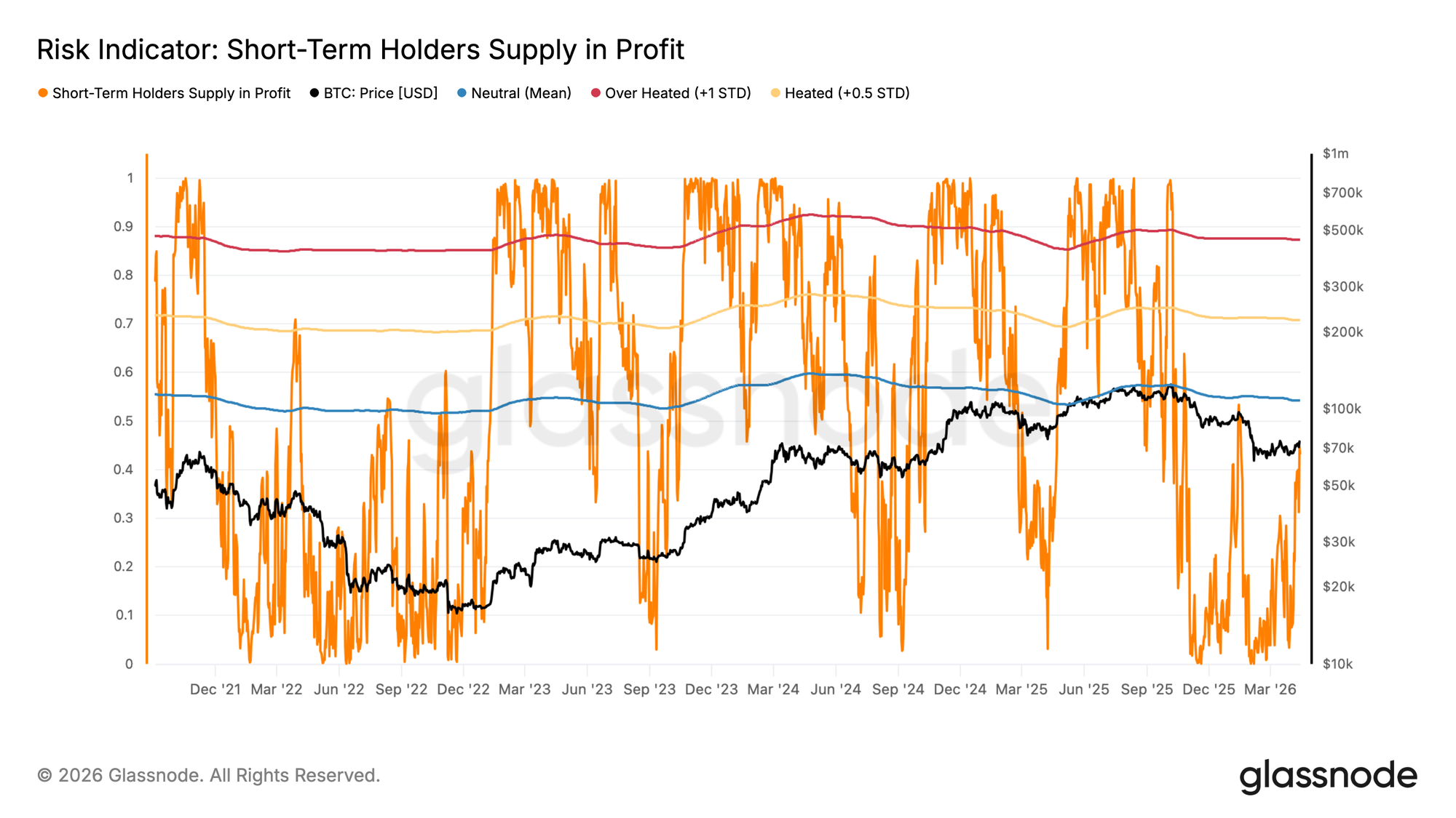 近期比特币价格触及7.6万美元水平,被多位市场观察者视为“动能转换”的关键标志,预示短期上涨趋势已获得基本面支持。根据Glassnode的链上追踪数据,当前短期持有者中处于未实现盈利状态的代币占比为43.2%,显著低于54.2%的历史均值临界点,表明本轮反弹尚未进入典型抛压集中区。