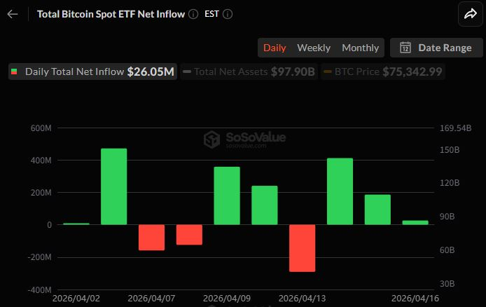 根据最新数据,截至当地时间4月16日,美国比特币现货ETF市场实现单日净流入2605万美元。继前两日分别录得4.115亿美元与1.8603亿美元的流入后,该市场已连续第三天保持资金净流入状态,但每日流入金额呈递减态势。截至目前,累计净流入总额已达570.8亿美元。