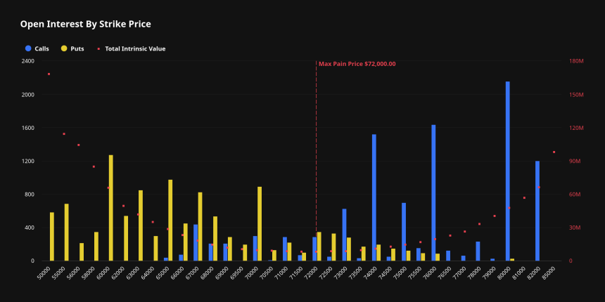 当前期权市场的最大持仓压力点位于72000美元水平。在近月到期合约中,80000美元、76000美元及74000美元三档看涨期权形成显著集中区域,反映出上方存在较强阻力,但亦隐含部分投资者对上行突破的期待。