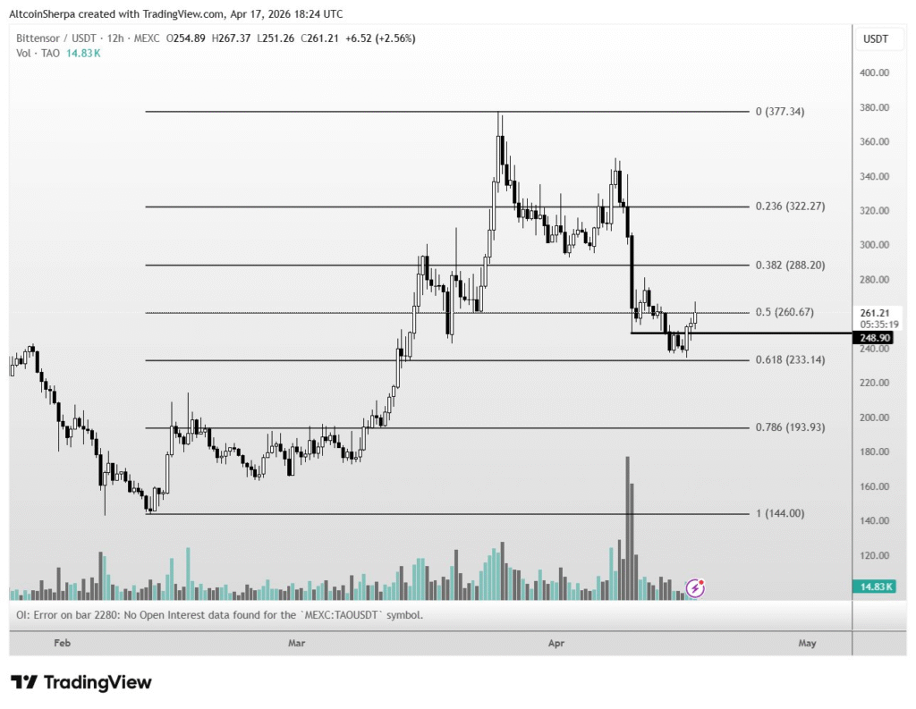 TAO自243美元低位反弹,成功守住260美元附近的0.618斐波那契回撤水平,显示出较强韧性。根据Altcoin Sherpa分析,该位置在12小时图中构成潜在反转信号,若持续走强,有望推动价格向300美元区间迈进。