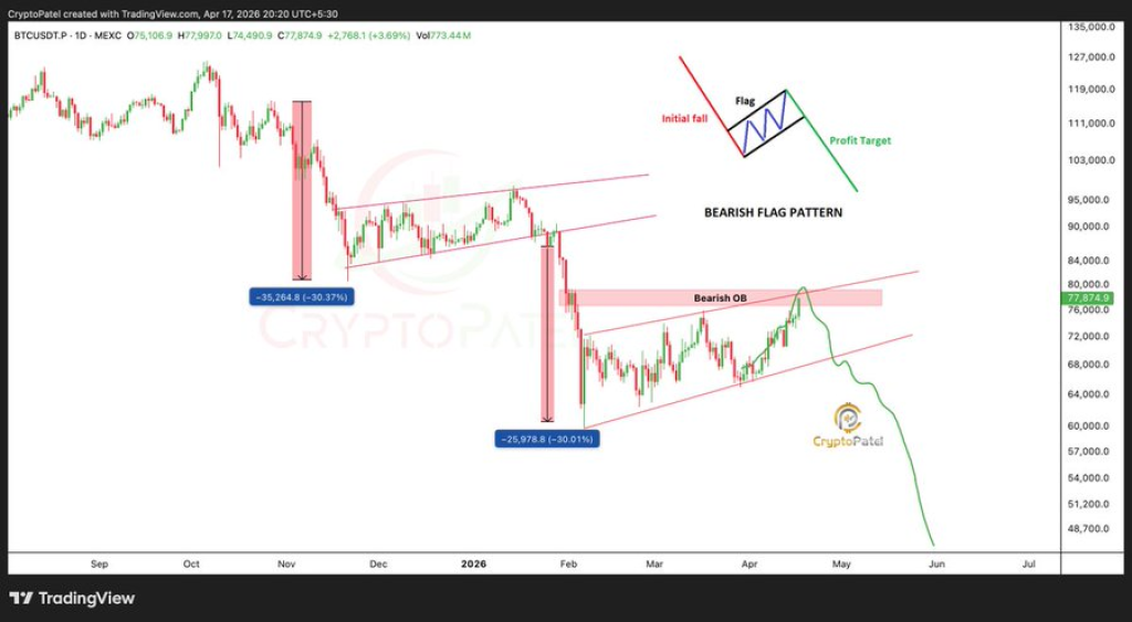 摘要:比特币本周挑战78,000美元关键阻力未果,价格回落至77,000美元附近。技术图表显示看跌旗形正在形成,若阻力持续有效,可能引发新一轮下跌,目标指向68,000美元区域。