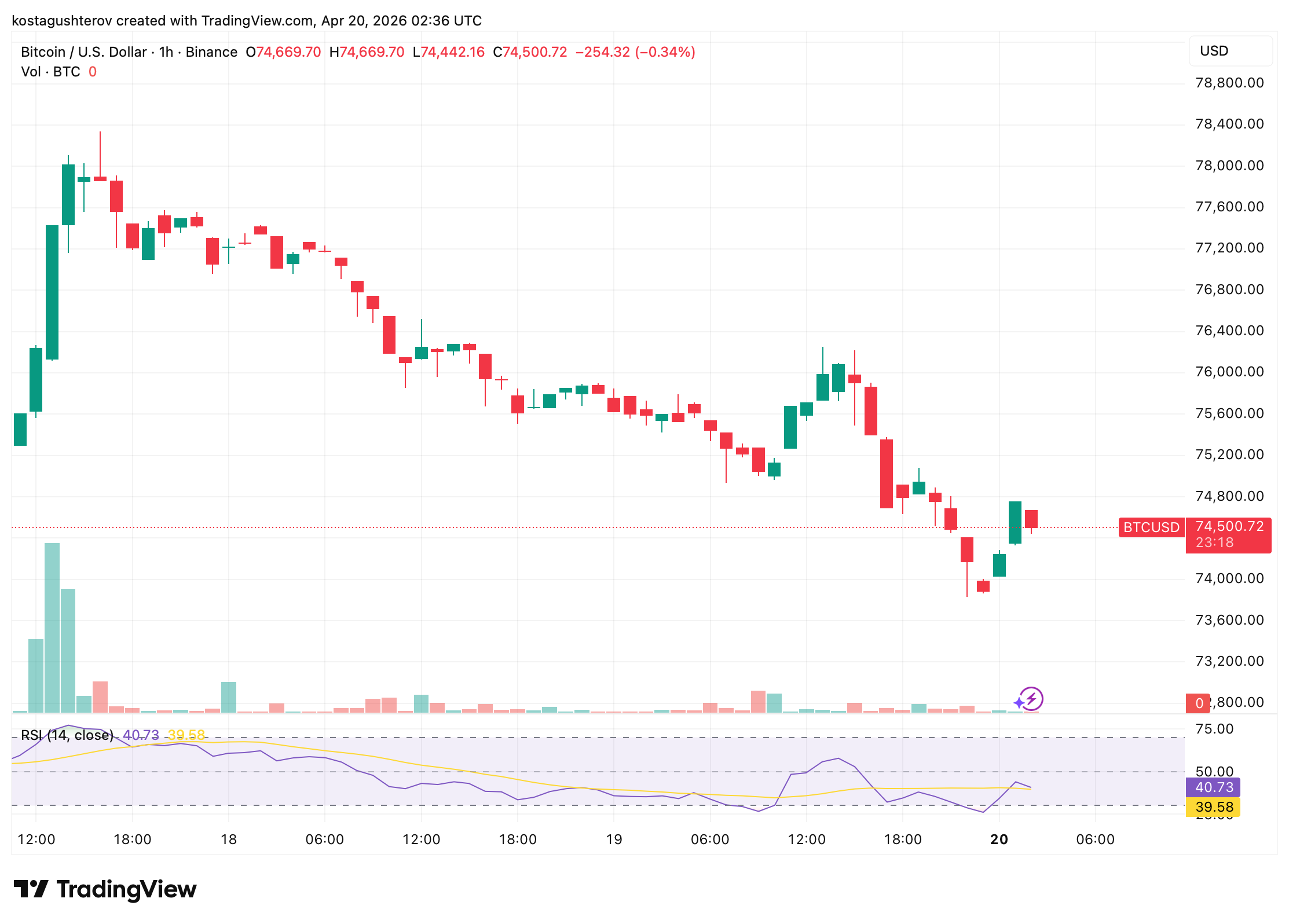 1小时图显示,比特币自4月18日触及78,000美元高点后,进入低流动性阴跌通道,至4月20日早间下探至74,500美元。相对强弱指数现报39.58,低于信号线40.73,已接近超卖区域,但尚未触及历史反弹触发阈值,表明下跌趋势虽持续,但加速空间有限。