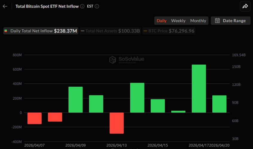 最新数据显示,截至4月20日(当地时间),美国比特币现货ETF市场单日净流入额达2亿3837万美元,连续第五个交易日呈现资金净流入状态,反映出投资者对数字资产配置的持续偏好。