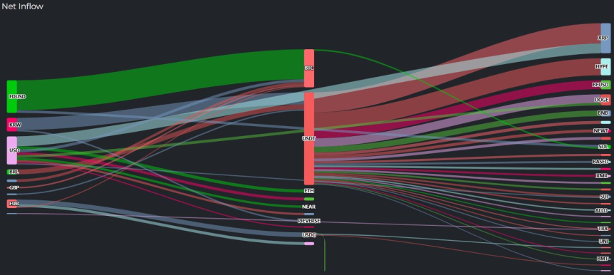 此外,市场变现活动频繁,通过美元实现的资产兑现规模达1013万美元,韩元渠道则有729万美元资金转出,反映部分投资者正在锁定利润或进行跨币种套利操作。