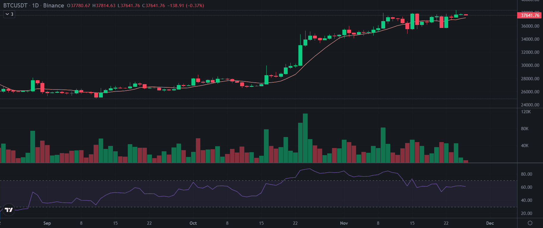 进入2023年末,比特币完成从阶段性低谷到强势反弹的显著转变,全年累计涨幅达120%,展现出超越市场普遍预期的韧性。尽管面临宏观压力与行业调整,其价格重心持续上移,当前稳定在37,600美元附近。