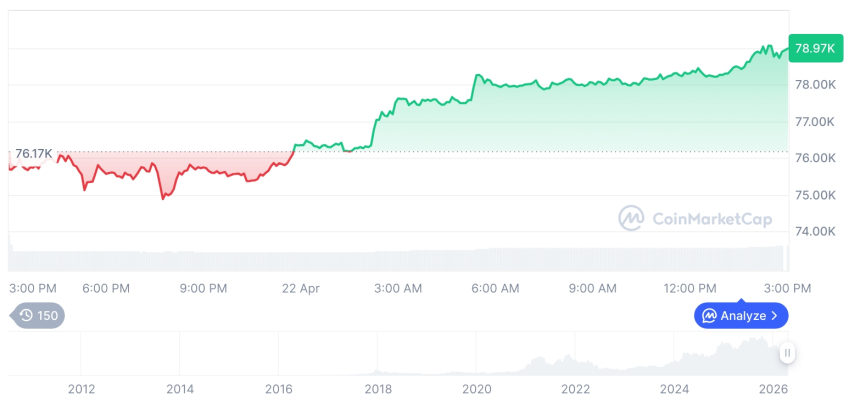 截至2026年4月23日凌晨0时4分,比特币录得4.47%的日内涨幅,价格攀升至79,072.72美元;以太坊同步走强,上涨4.53%,报收于2,404.53美元。
