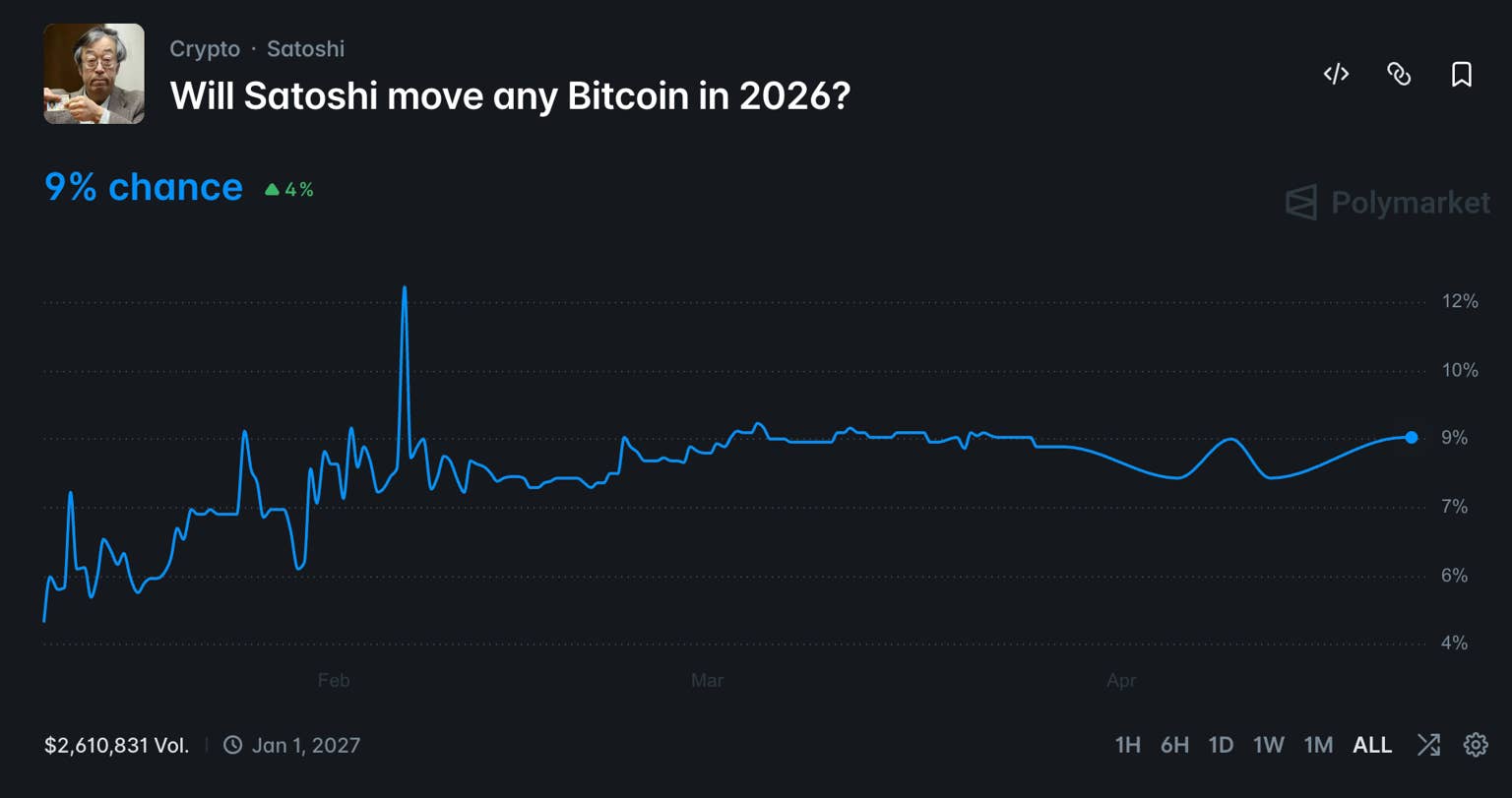 受近期价格回调影响,市场参与者转向长期预测,聚焦2026年中本聪是否将释放其持币。目前,针对该事件的预测概率已达9%,相较此前增长4个百分点。相关合约累计投注金额达260万美元,最终结果将于2027年1月1日自动执行并清算。