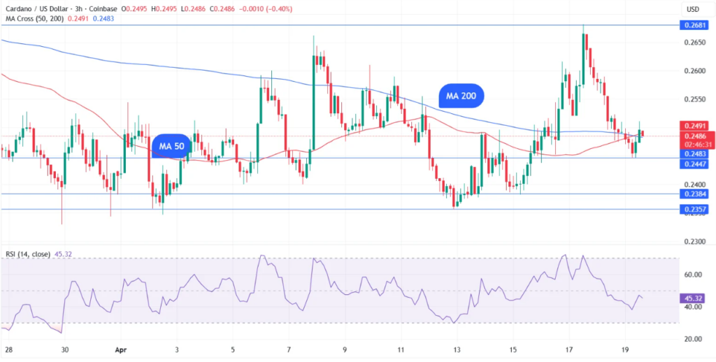 经历连续两日回调后,ADA现价约0.2496美元,周涨幅仍达4.80%。自二月初以来,其始终在0.22至0.30美元区间震荡,显示买卖双方缺乏明确共识。四月内数次挑战日线50日均线(约0.257美元)均告失败,强化该位作为关键阻力的地位。
