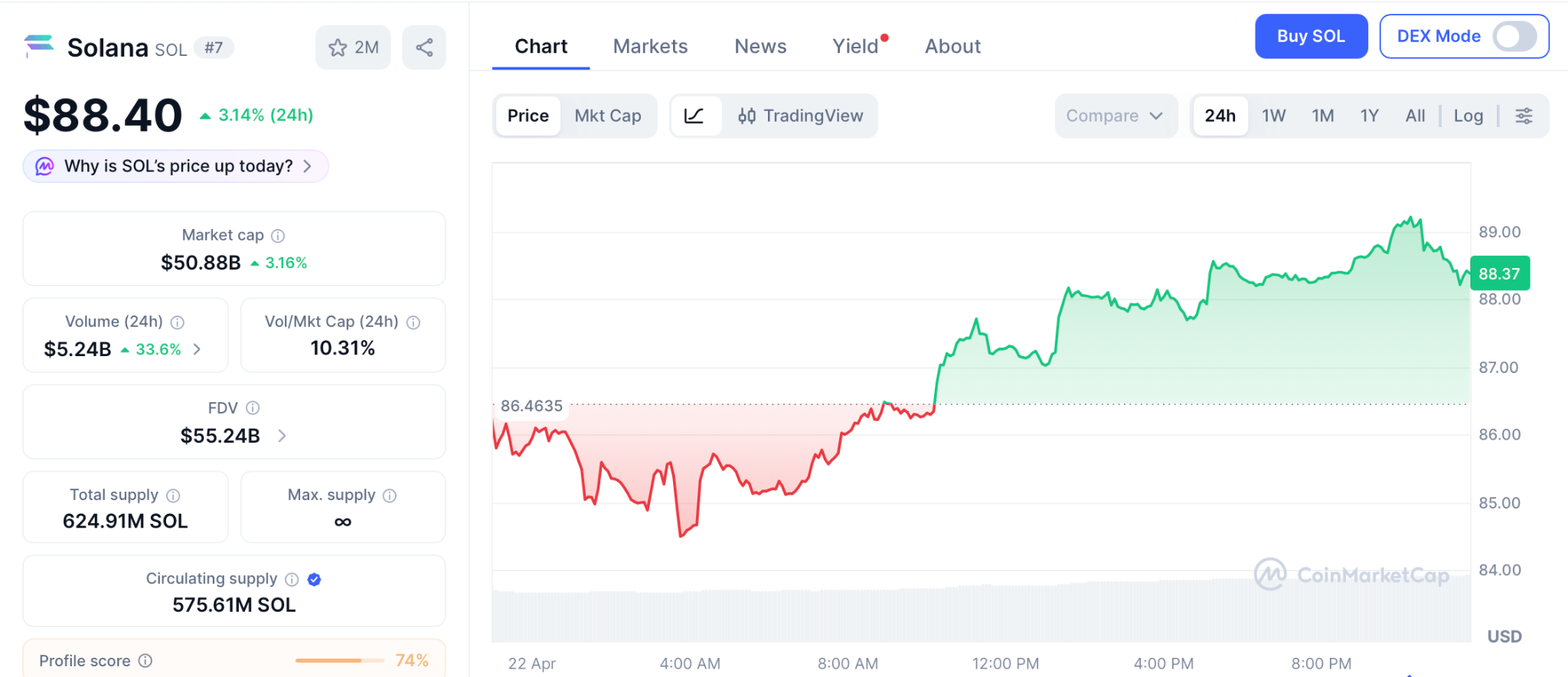 截至4月21日,Solana代币(SOL)报价为88.40美元,24小时内交易量激增至40亿美元,环比增长29.5%。这一走势由多重基本面因素共同推动:第一季度链上经济总量突破1.1万亿美元,完成253亿笔交易,去中心化应用收入连续五周领先以太坊;新增开发者数量达4100人,使网络开发者份额攀升至23%,反超以太坊。