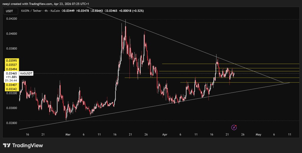 近六日,卡斯帕价格稳定在0.0340至0.0353美元之间波动,其中0.0340至0.0349美元区间构成更密集的交易带,显示出买方与卖方的对峙状态。此结构常为后续大幅波动前的休整阶段。若有效突破0.0349美元,则有望向0.0395美元目标推进,但上方下行三角形压力可能延缓上行节奏。反之,若跌破0.0340美元,下探至0.0334美元的风险上升。