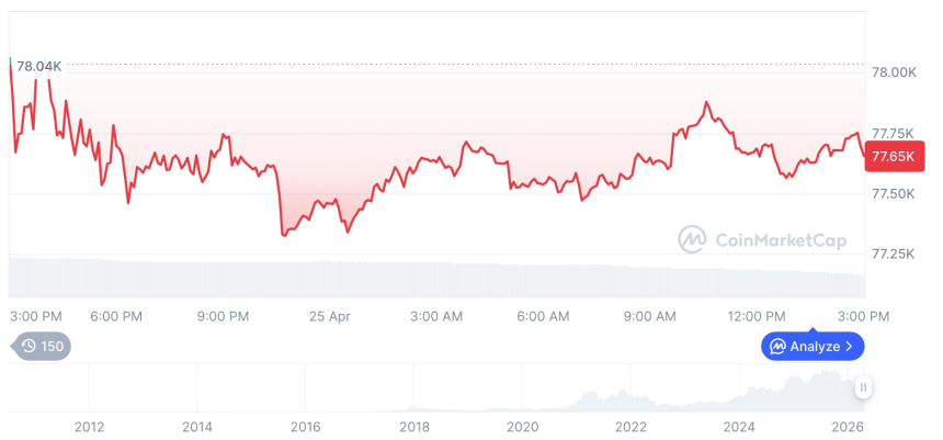 截至基准时间,比特币报77,658.61美元,较前一日下跌0.51%;以太坊报价2,316.39美元,实现0.09%的轻微上涨。