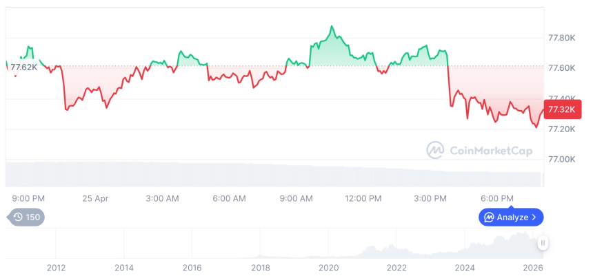 截至4月26日下午2时04分,比特币报价为77,342.12美元,较前日下跌0.30%;以太坊报2,311.46美元,跌幅达0.42%。多数主流竞争币同步承压,其中XRP下跌1.32%至1.42美元,BNB下挫1.53%至628.83美元,Solana回落0.79%至85.71美元,TRON与狗狗币分别录得0.19%和0.69%的降幅。