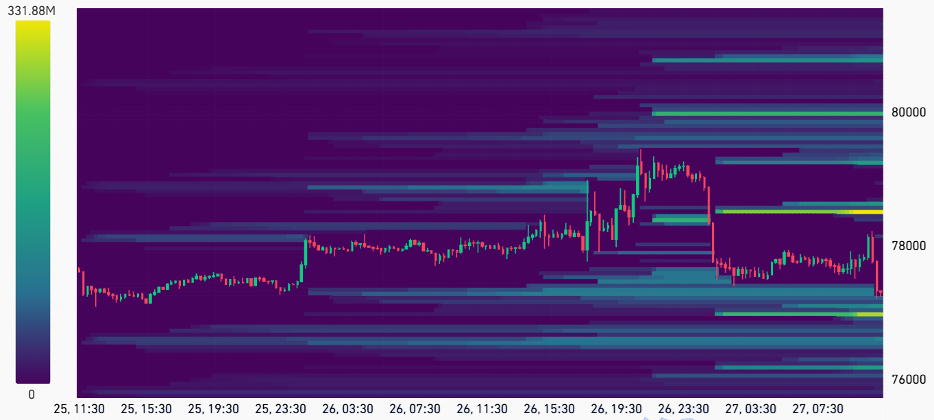 比特币永续期货年化资金费率连续两周处于负值区间,反映市场参与者普遍持有看跌预期。这一现象出现在4月9日价格从72,000美元跃升至78,000美元期间,而大量空头头寸集中在76,700美元价位已出现浮亏。若价格再度上攻至80,000美元上方,极有可能触发强制平仓,形成空头挤压。
