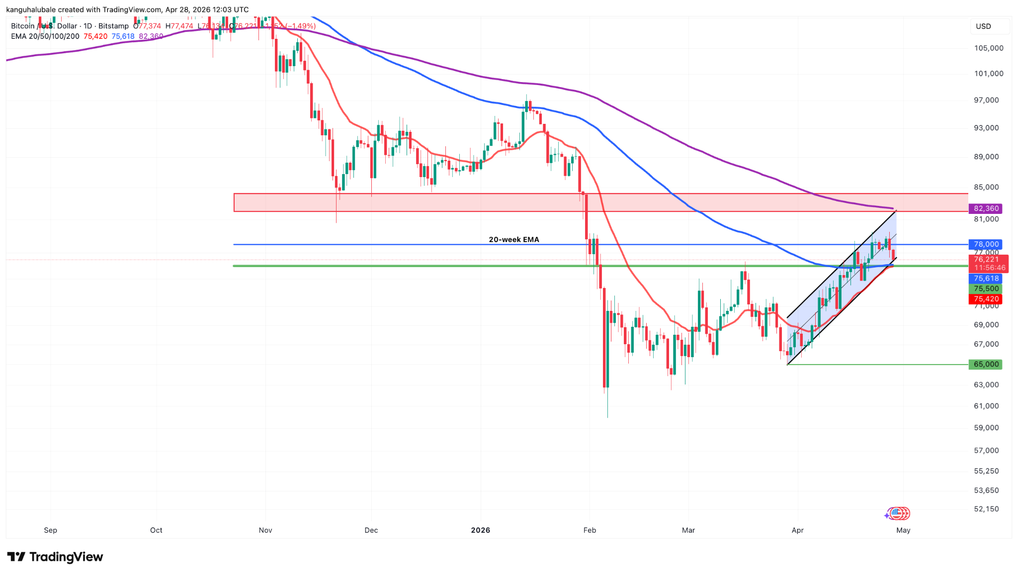 下行方面,价格重新测试75,500美元支撑位,该位置恰好对应20日与100日指数移动平均线交汇点,同时为上升通道下轨,具备多重技术意义。