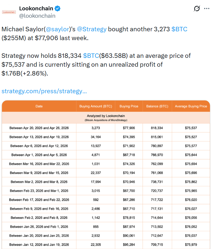 数据显示,策略公司在4月20日至26日间新增购入3,273枚比特币(约2.55亿美元),总持仓量升至818,334枚。这一数字已超过贝莱德代表客户持有的约812,300枚,成为全球最大的上市比特币持有实体。