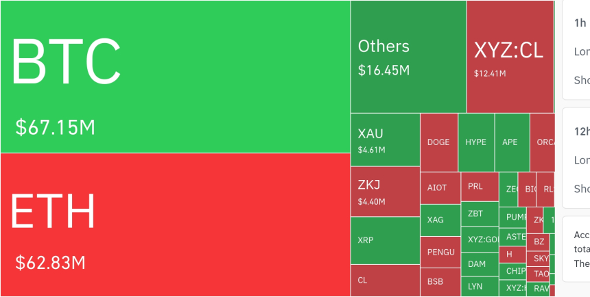 24小时清算热力图显示,比特币以6715万美元、以太坊6283万美元位列前二,其他资产合计1645万美元紧随其后。个别项目如XYZ:CL录得1241万美元清算,XAU与ZKJ分别达461万和440万美元,数值显著。综合各时间尺度数据,空头清算持续占优,被普遍视为市场短期反弹引致的轧空现象。