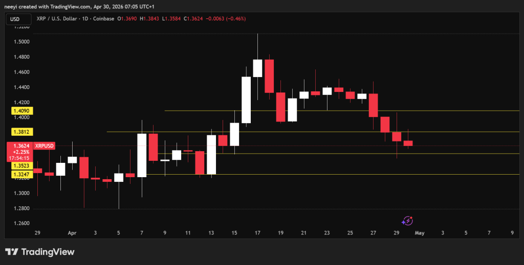 在未能延续近期反弹势头后,XRP价格开始回调并逼近前期重要支撑区间。当前价位接近1.35美元水平,该区域一旦失守,可能引发更大幅度的下行波动。