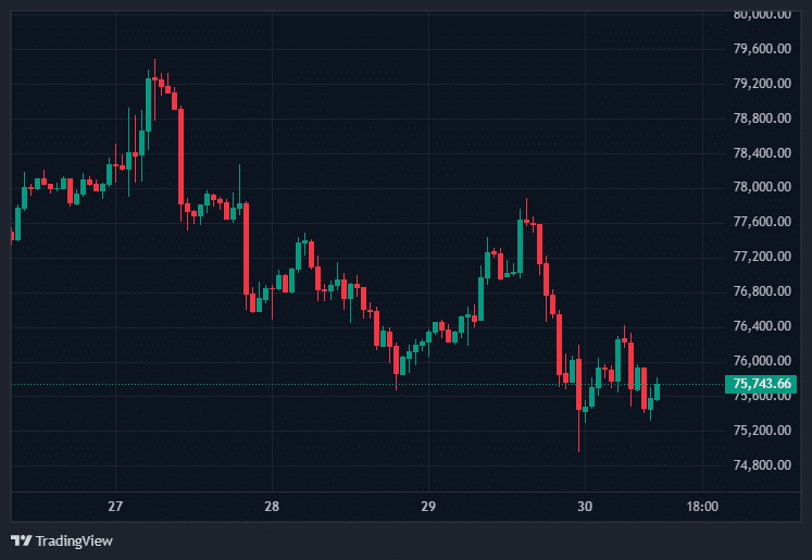比特币价格收于约75,700美元,日内跌幅2.1%,周线累计回落近3%。此前在74,000至78,000美元之间的窄幅震荡格局已被打破,当前价位75,743美元显示其在宏观不确定性与卖压双重夹击下维持支撑能力减弱。