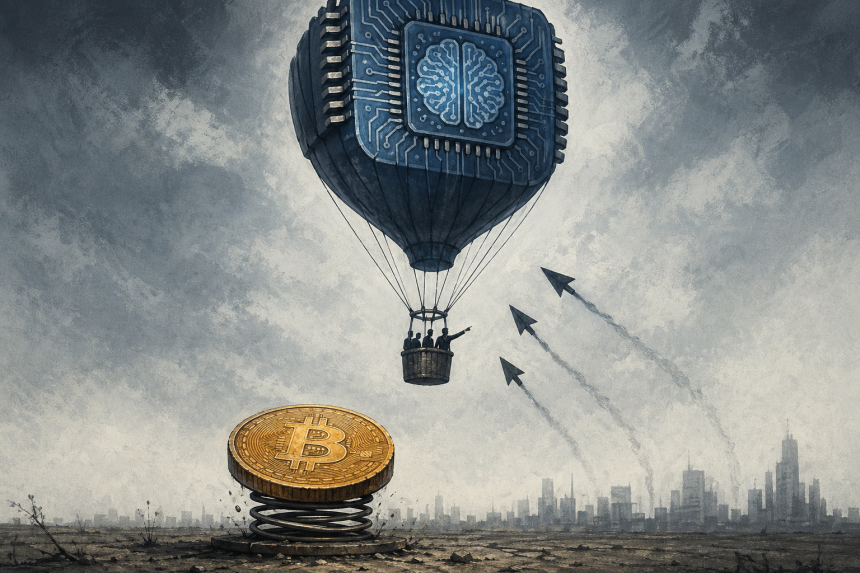 数据显示,主要人工智能企业指数目前交易水平较过去四年对数趋势高出约33%,而比特币价格则低于其长期基准43%。这一差距被评价为“前所未有的背离”,反映出资本配置的极端倾斜。