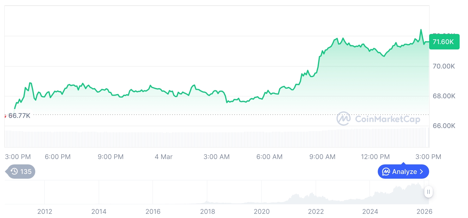 摘要:加密货币市场出现显著波动,比特币价格突破71,000美元关口,单日涨幅超8%,以太坊亦录得逾7%增长,市场交易活动回暖。