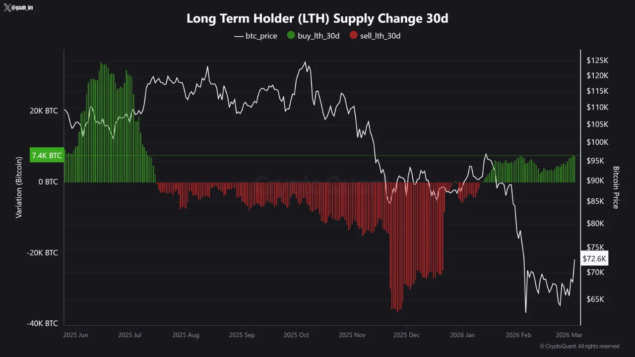 自2025年6月至2026年3月初,CryptoQuant数据显示,比特币长期持有者(至少155天未移动)在经历长达八个月的净卖出后,已重新进入净积累状态。最新30天内,其累计买入量约为7,400枚比特币,接近2025年夏季上涨阶段的水平,标志着市场情绪发生结构性转变。从抛售到积累:图表揭示趋势反转