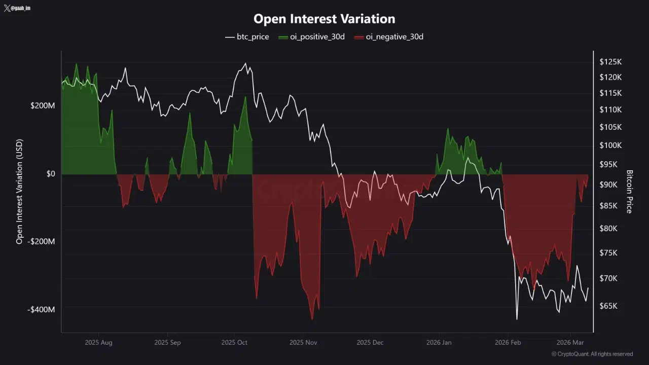 CryptoQuant的30天持仓量滚动指标显示,比特币期货市场在经历四个月持续负值后,正从下方逼近零轴。该数据曾于2025年11月至2026年2月间触及负4亿美元的极端水平,对应价格约65,000美元,为强平最剧烈阶段。当前红色区域收缩,图表右端初现绿色,表明新资金开始进入期货市场,去杠杆进程趋于结束。负资金费率下的空头押注风险