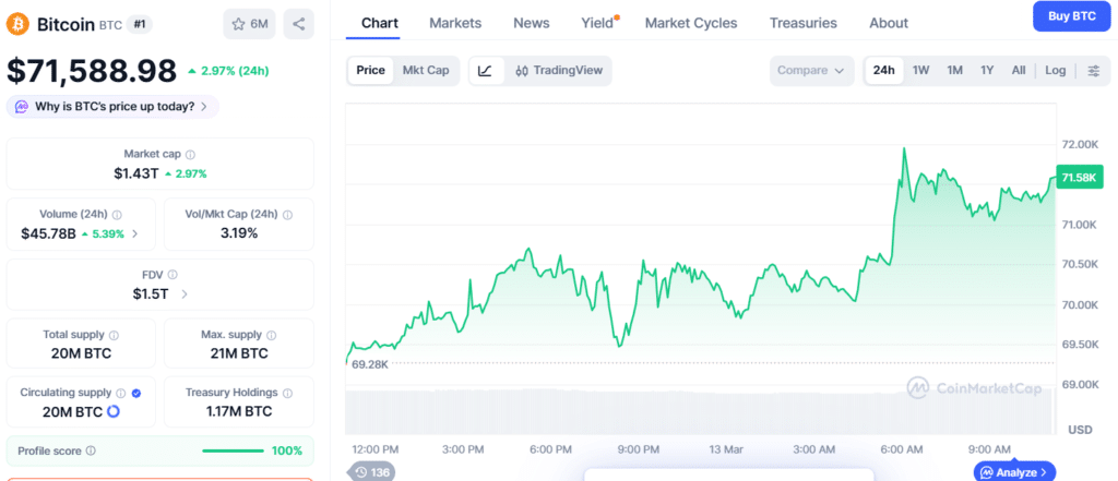 尽管国际油价攀升至每桶100美元水平,且全球航运通道面临潜在中断风险,比特币价格依然表现出显著稳定性,持续在70,000美元区间运行。这一表现与历史周期中宏观压力导致加密资产大幅回调的模式形成鲜明对比。 近期数据显示,比特币在过去24小时内上涨2.97%,交易价约为71,598.81美元,标志着市场从此前波动中逐步恢复信心,展现出更强的内在韧性。外部冲击下比特币为何能稳住阵脚?