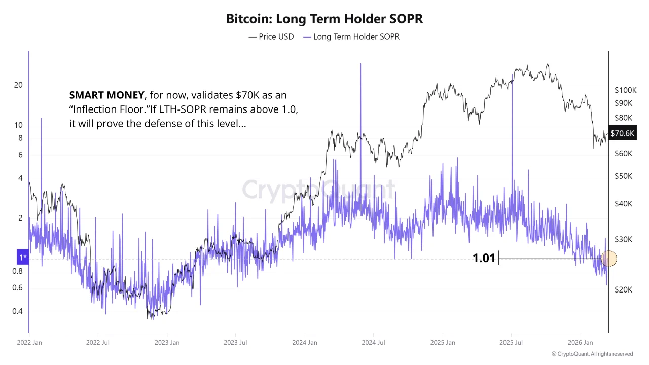 LTH-SOPR聚焦于持有超过155天的比特币钱包,反映的是基于信念而非短期波动的持仓结构。当该指标高于1.0时,意味着这些资深参与者转移的资产普遍处于盈利状态;低于1.0则表明其正在亏损兑现。目前1.01的读数恰好位于盈亏平衡线上,显示大额持有者正围绕70,000美元区间进行小幅调整,而非系统性撤离。