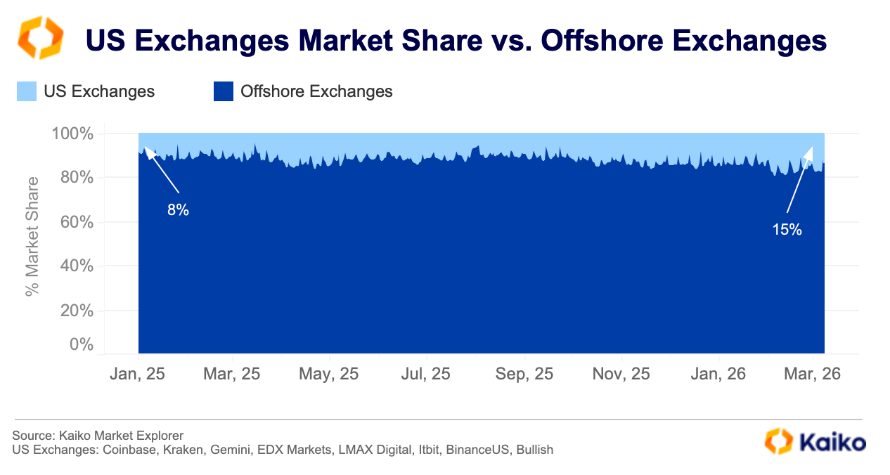 摘要:美国加密交易所凭借机构参与度提升与监管环境优化,市场份额从年初8%升至15%,在流动性深度上实现显著超越。比特币现货ETF推动结构性需求,头部平台主导交易格局。