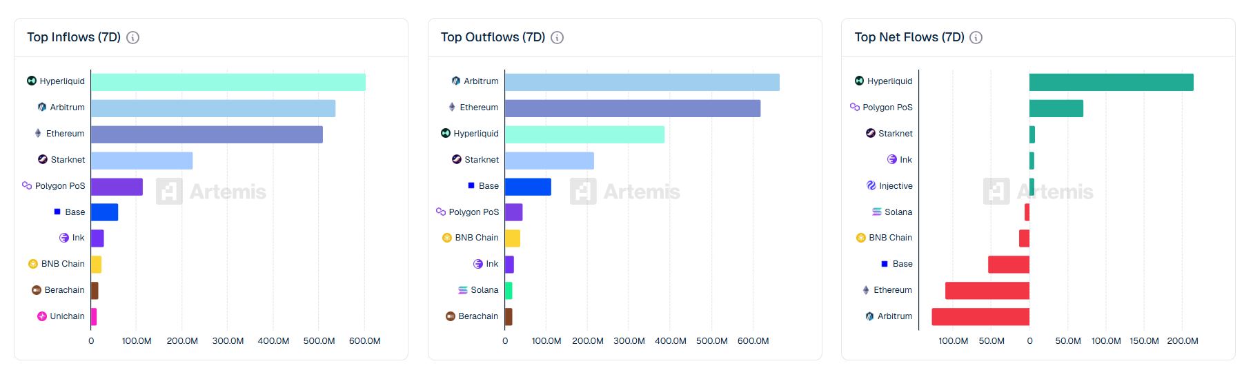 摘要:根据Artemis最新数据,过去一周跨链资金呈现显著分化。Hyperliquid成为最大净流入链,而Arbitrum则持续面临资金外流压力,多条主流链流动性格局重塑。