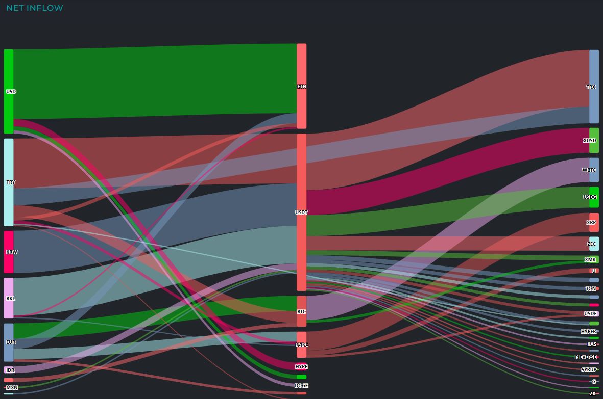 欧元资金流向包括比特币(470万美元)、以太坊(320万美元)及USDC(320万美元);而韩元与雷亚尔全部转换为泰达币(USDT),反映对高流动性稳定币的强烈偏好。