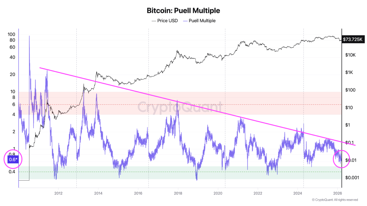 该数值反映市场尚未形成明显的投机溢价,正处于去泡沫化的调整阶段。然而,这一状态并不等同于触底反弹或新一轮上升周期的开启,而是呈现出围绕长期持有成本进行横向震荡的特征。