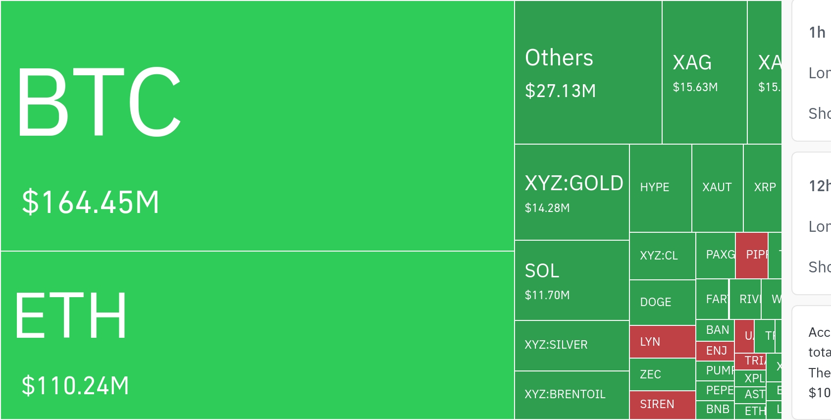 值得注意的是,与黄金及白银挂钩的数字资产也出现明显抛压:XAG代币清算达1563万美元,XYZ:GOLD清算1428万美元,反映出这类资产的市场韧性正面临考验,其价格波动已逐步向主流加密生态传导。