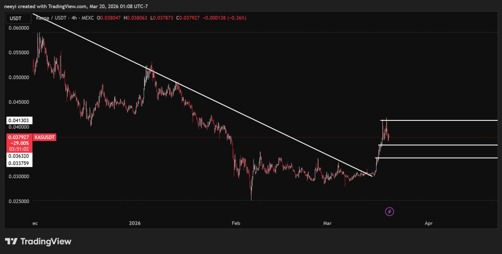 过去五个交易日内,Kaspa累计涨幅接近40%,成功站稳0.038美元水平。此次反弹突破下降趋势线,通常被视为短期动能转变的信号。价格曾短暂触及0.0419美元后出现回落,表明该区间存在明显抛售压力。目前0.040至0.042美元范围已被确认为重要阻力带,后续走势或由此决定。