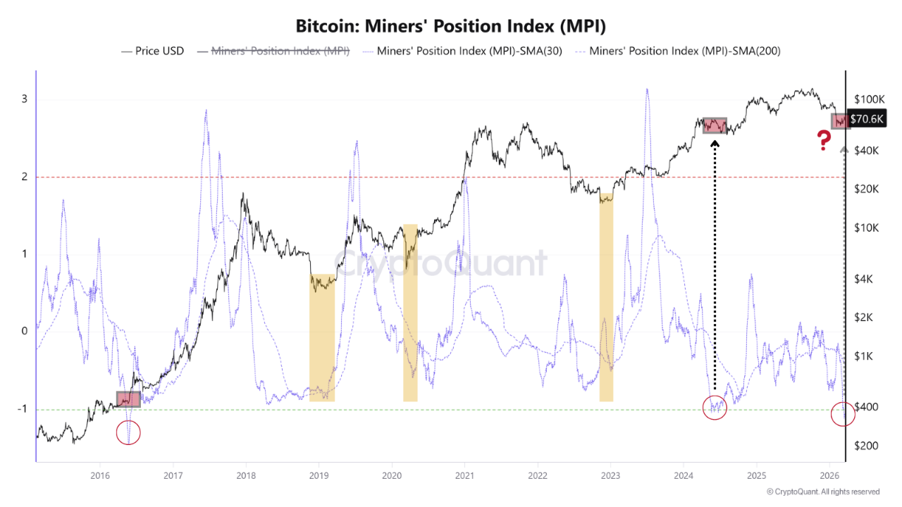 比特币矿工持仓指数(MPI)已滑落至-1.04,成为该指标自记录以来的最低水平之一。这一数值不仅刷新了历史低位,更标志着其30日移动平均线第三次逼近-1关口。