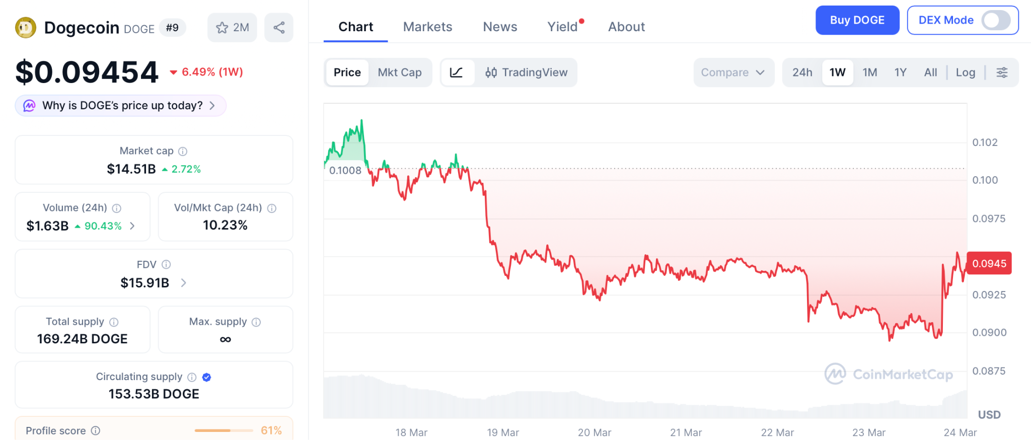 截至3月23日,狗狗币报价约为0.094美元,较历史高点0.73美元下跌逾87%。尽管21Shares狗狗币ETF为机构提供了合规参与路径,且RSI指标进入超卖区预示反弹可能,但从0.094美元起步,全年目标0.25美元仅带来2.8倍涨幅。