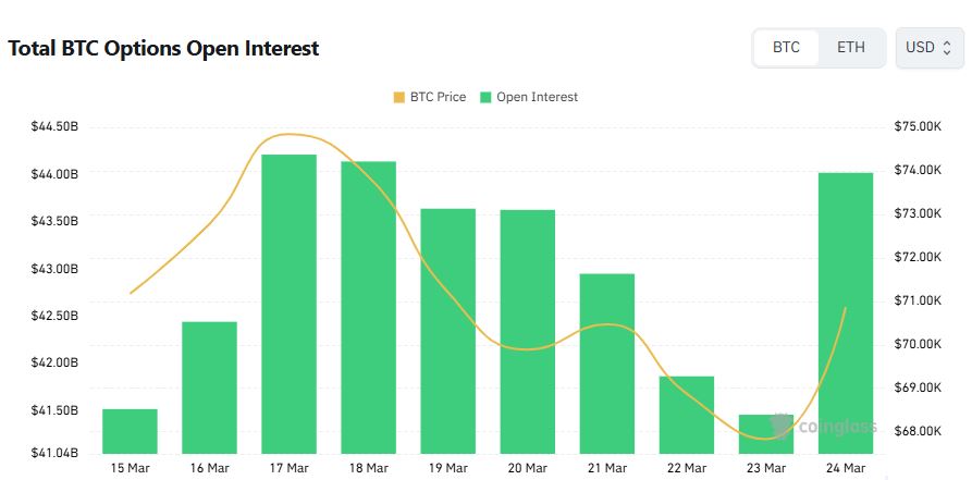 截至24日上午9时,比特币期权未平仓合约总额达440.2亿美元,较前一日环比增长约6.18%。其中,看涨期权占58.28%,看跌期权占41.72%。