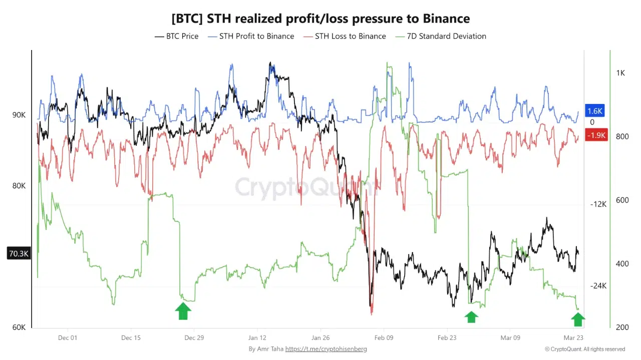 摘要:CryptoQuant监测显示,币安短期持有者抛售行为的波动性已三次回落至低水平,反映市场动荡正在缓解。