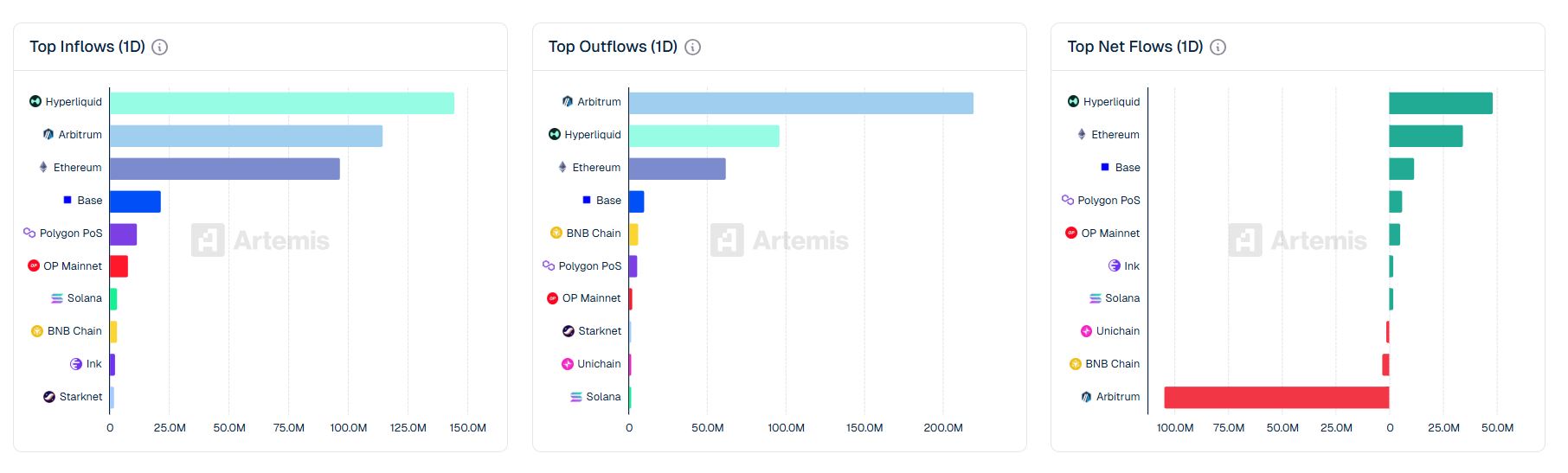 摘要:根据Artemis数据,过去一周Hyperliquid成为跨链桥资金净流入最多的区块链网络,而Arbitrum则录得最大净流出额。