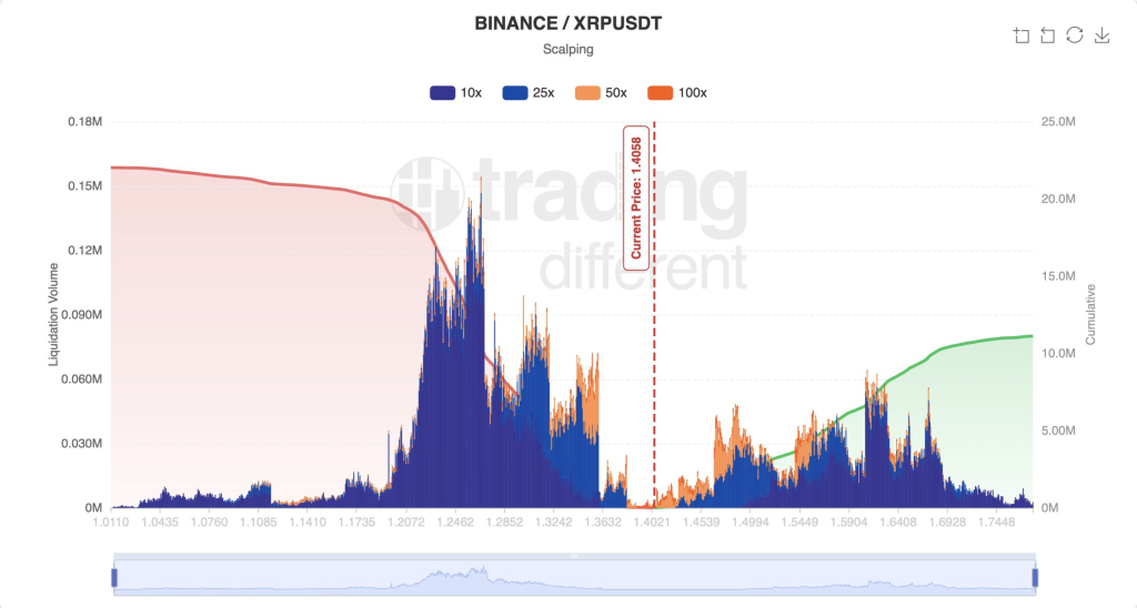 第二张图表按3倍、5倍、10倍及25倍等不同杠杆层级细分了清算分布。结果显示,空头头寸高度集中在当前价格之上,尤其在1.42美元以上区域形成密集集群。这些仓位并非短期形成,而是源于数周横盘期中交易者对进一步下跌的押注。