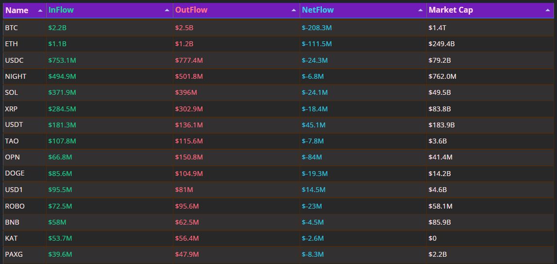 摘要:过去24小时内,比特币与以太坊等主流币种普遍出现显著资金外流,反映市场避险情绪升温。