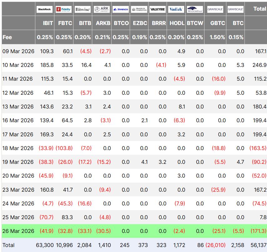 根据Farside Investors最新数据,美国现货比特币交易所交易基金在周四录得高达1.71亿美元的资金外流,创下自3月3日以来的单日赎回峰值。